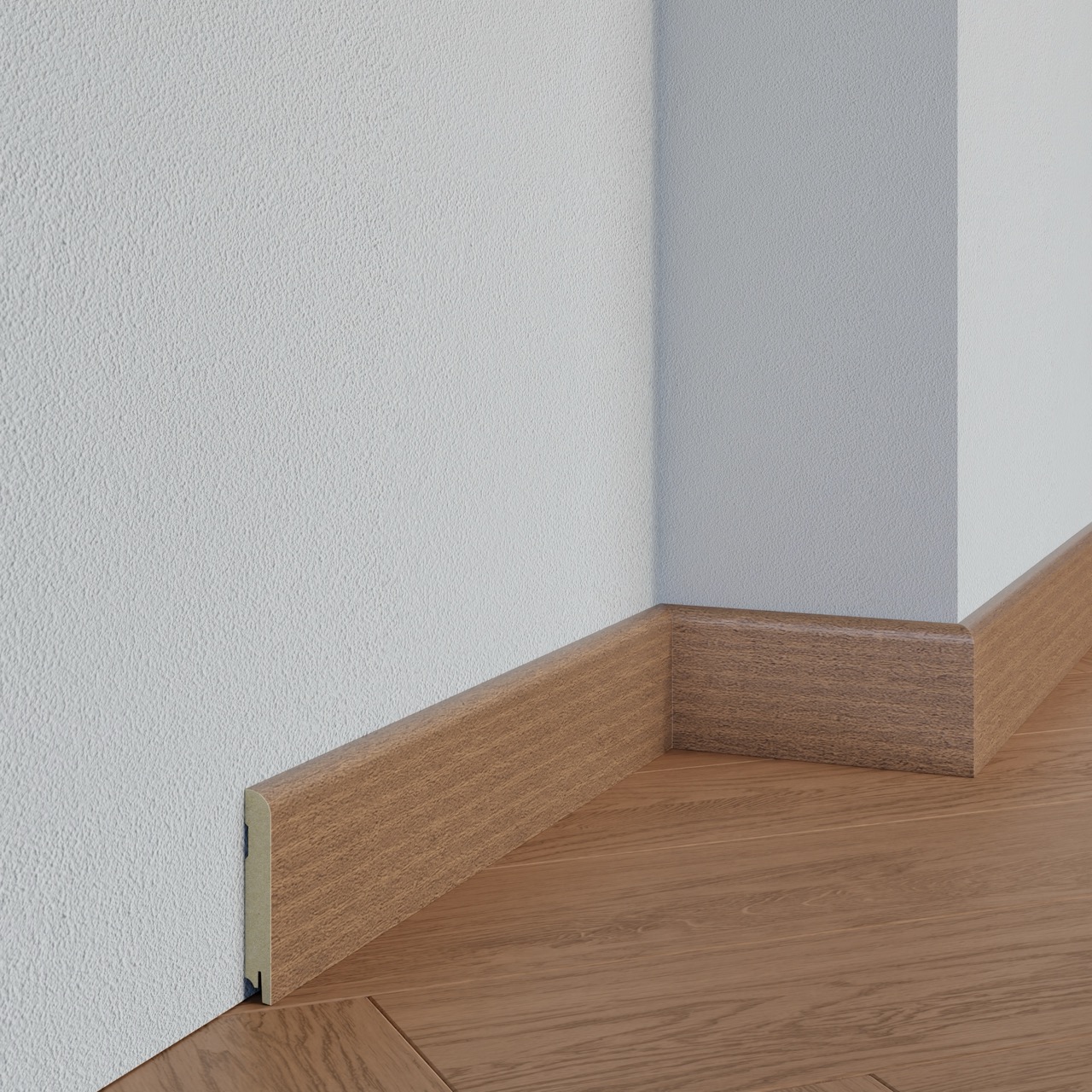 Deze fineerplint heeft een multiplexkern en is ommanteld met een laag folie met houtprint (mahonie). Deze plint is extreem sterk en vochtbestendig. Daarnaast is deze plint erg stabiel en verkleurt hij niet door zonlicht.