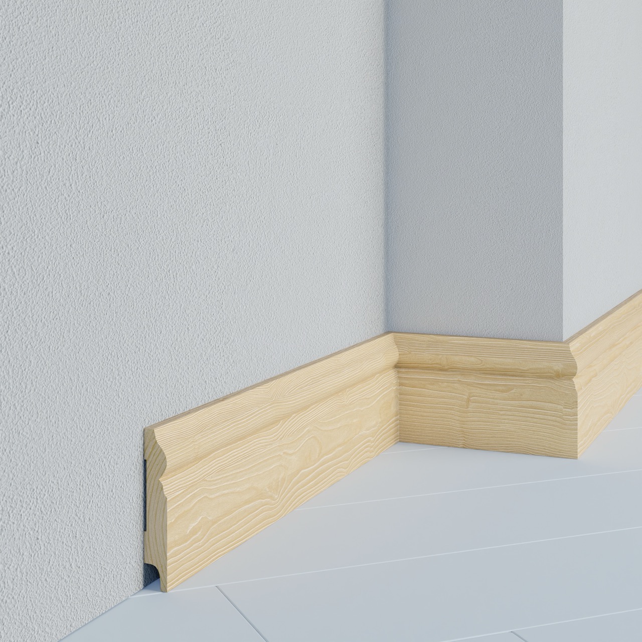 Deze plint is gemaakt van licht rustiek grenen met kleine knoesten en is niet verlijmd of gevingerlast. Uw plint wordt dus uit stuk hout gemaakt en is in alle afwerkingen te verkrijgen.